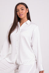 Long-sleeved satin button down shirt with sharp collars. Ankle-length trouser pants with elastic stretch at the waist.